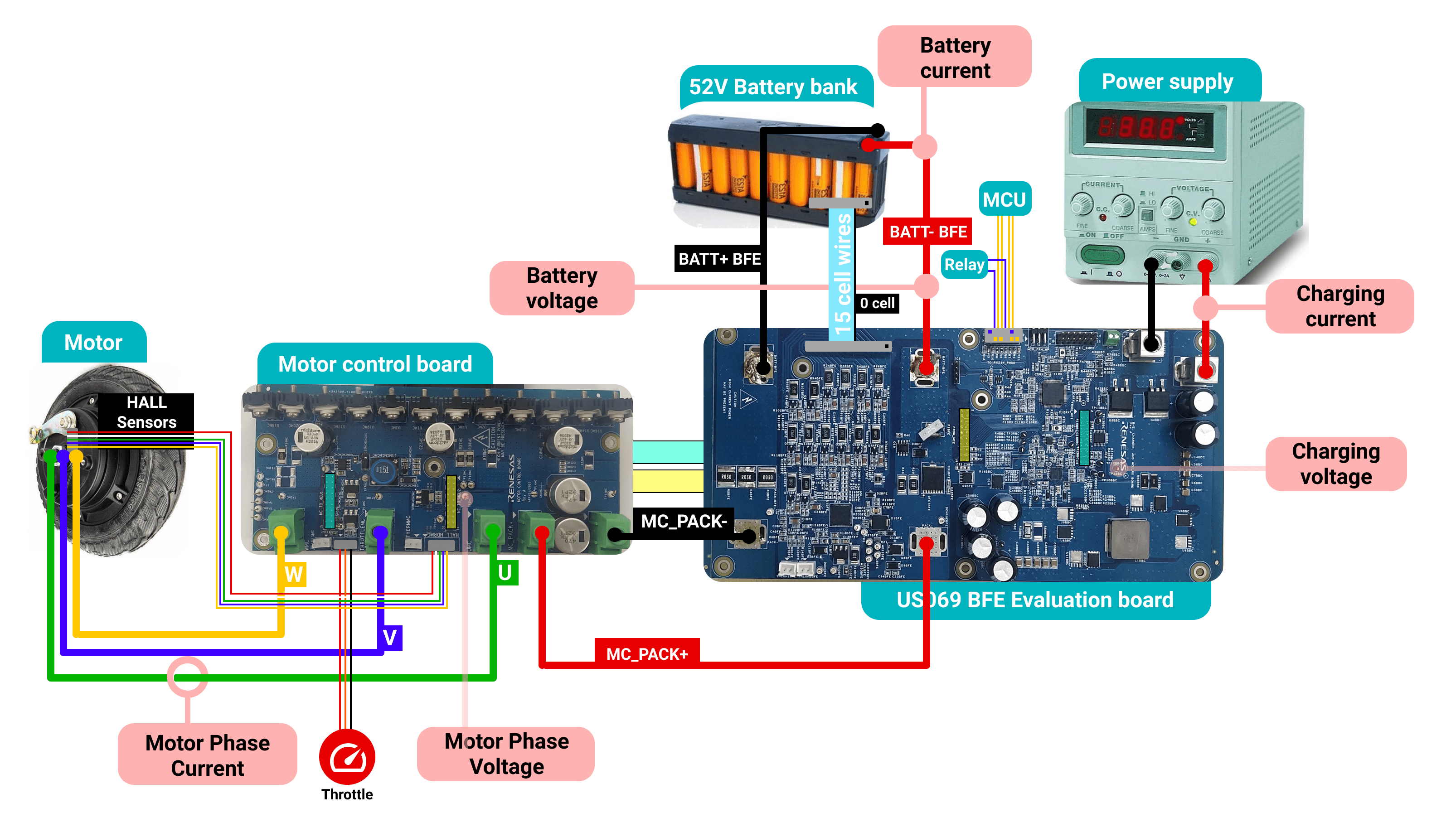 The US069 48V E-Mobility Solution is a proof-of-concept (POC) that includes all electrical components of a higher voltage (36V-48V) power train system. The motherboard contains the MCU (RX23T), which is employed as the system’s main controller. The RX23T is in-charge of setting up and monitoring the Battery Front End (ISL94216). This setup allows charging the batteries using the ISL81801 (Buck-boost controller) and controlling the inverter board which drives the 48V BLDC motor.
